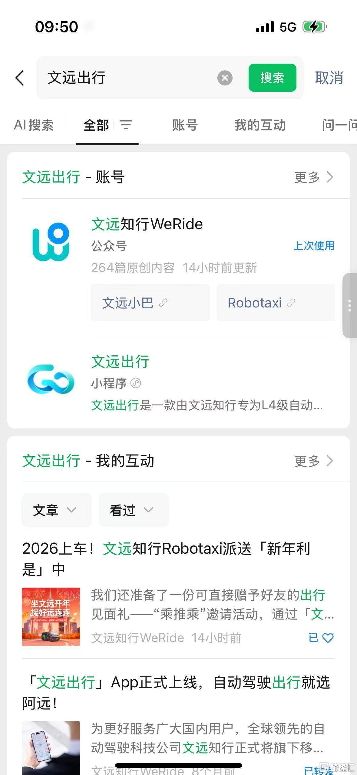1月14日,Robotaxi出行职业小程小引远出行认真上线。用户无需突出下载利用,只需通过微信搜索「文远出行」小关节,即可在广州、北京等运营区域内一键呼唤文远知行Robotaxi,草率体验闲适、安全、方便的无东说念主驾驶出行职业。