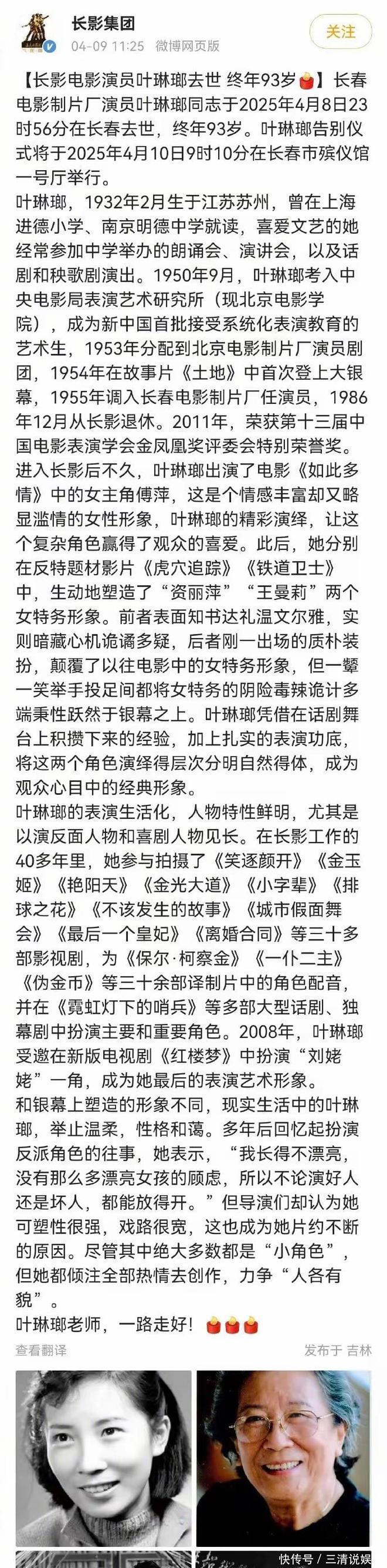4月8日23,93岁的叶琳瑯短暂离世。