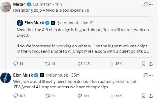 马斯克周末在酬酢媒体发贴称,既然 AI5 芯片谋划依然老练,特斯拉将重启 Dojo3 的研发职责。