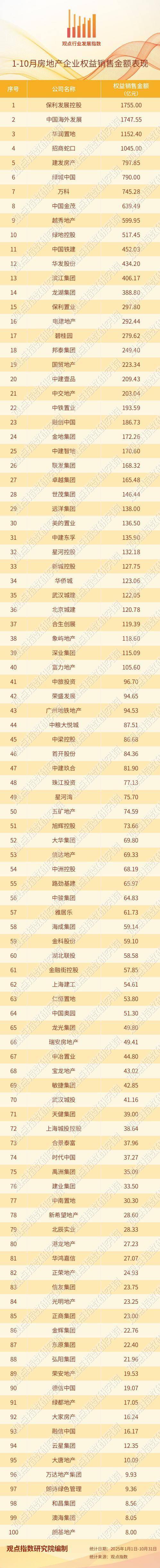 不雅点指数 “2025年1-10月房地产企业销售证实”究诘恶果自满,保利发展、中海地产和华润置地占据权益销售金额的前三,分辨录得1755亿元、1747.55亿元以及1152.4亿元。招商蛇口和建发房产紧随自后,为1045亿元、797.85亿元。权益销售金额朝上500亿元的企业环比上月增多1家。
