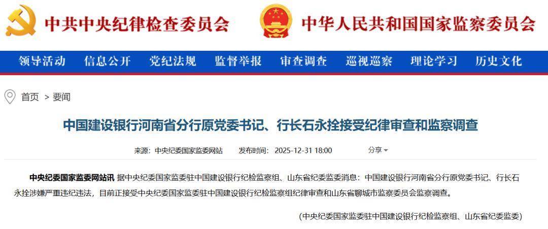 中国建树银行河南省分行原党委通知、行长石永拴涉嫌严重违法违警欧洲杯体育,现在正吸收中央纪委国度监委驻中国建树银行纪检监察组秩序审查和山东省聊城市监察委员会监察探访。